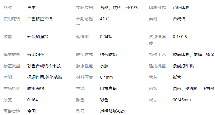 本网页所展示的有关【透明不干胶贴纸防水强黏撕不烂 烫金薄膜类日化品标签_不干胶纸_青岛百丰包装有限公司】的信息/图片/参数等由德茂源毅丰的会员【青岛百丰包装有限公司】提供,由德茂源毅丰会员【青岛百丰包装有限公司】自行对信息/图片/参数等的真实性、准确性和合法性负责,本平台(本网站)仅提供展示服务,请谨慎交易,因交易而产生的法律关系及法律纠纷由您自行协商解决,本平台(本网站)对此不承担任何责任。您在本网页可以浏览【透明不干胶贴纸防水强黏撕不烂 烫金薄膜类日化品标签_不干胶纸_青岛百丰包装有限公司】有关的信息/图片/价格等及提供【透明不干胶贴纸防水强黏撕不烂 烫金薄膜类日化品标签_不干胶纸_青岛百丰包装有限公司】的商家公司简介、联系方式等信息。