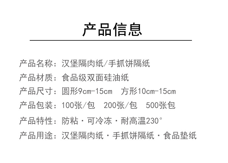 本网页所展示的有关【汉堡隔肉纸隔层油纸压肉纸牛肉饼垫纸防粘食品冷冻手抓饼隔离纸_厨房用纸_佛山市瑞扬纸品有限公司】的信息/图片/参数等由德茂源毅丰的会员【佛山市瑞扬纸品有限公司】提供,由德茂源毅丰会员【佛山市瑞扬纸品有限公司】自行对信息/图片/参数等的真实性、准确性和合法性负责,本平台(本网站)仅提供展示服务,请谨慎交易,因交易而产生的法律关系及法律纠纷由您自行协商解决,本平台(本网站)对此不承担任何责任。您在本网页可以浏览【汉堡隔肉纸隔层油纸压肉纸牛肉饼垫纸防粘食品冷冻手抓饼隔离纸_厨房用纸_佛山市瑞扬纸品有限公司】有关的信息/图片/价格等及提供【汉堡隔肉纸隔层油纸压肉纸牛肉饼垫纸防粘食品冷冻手抓饼隔离纸_厨房用纸_佛山市瑞扬纸品有限公司】的商家公司简介、联系方式等信息。