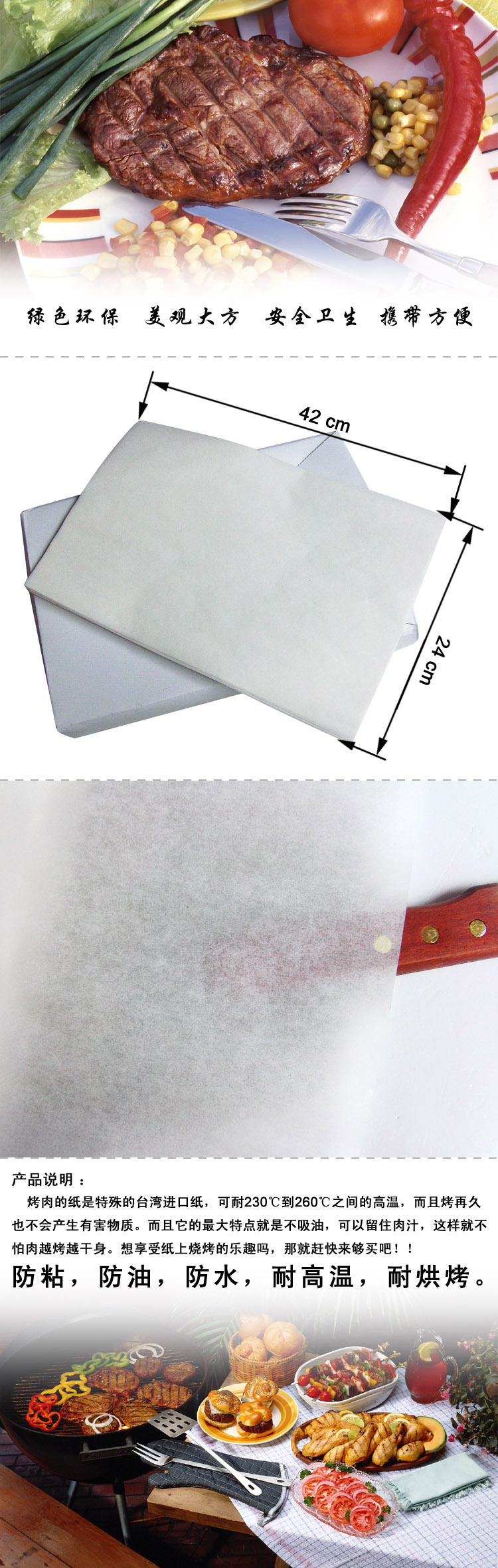 1.避免菜蔬肉类粘连烤盘,防止局部焦糊产生有害物质,从而免去不停更换烤盘之苦、不断清洗烤盘之烦,一餐只需换几张纸即可,清洁卫生方便。