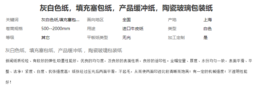 本网页所展示的有关【灰白色纸,填充塞包纸,产品缓冲纸装纸_牛皮纸_山东泉林纸业夏津有限公司】的信息/图片/参数等由德茂源毅丰的会员【山东泉林纸业夏津有限公司】提供,由德茂源毅丰会员【山东泉林纸业夏津有限公司】自行对信息/图片/参数等的真实性、准确性和合法性负责,本平台(本网站)仅提供展示服务,请谨慎交易,因交易而产生的法律关系及法律纠纷由您自行协商解决,本平台(本网站)对此不承担任何责任。您在本网页可以浏览【灰白色纸,填充塞包纸,产品缓冲纸装纸_牛皮纸_山东泉林纸业夏津有限公司】有关的信息/图片/价格等及提供【灰白色纸,填充塞包纸,产品缓冲纸装纸_牛皮纸_山东泉林纸业夏津有限公司】的商家公司简介、联系方式等信息。