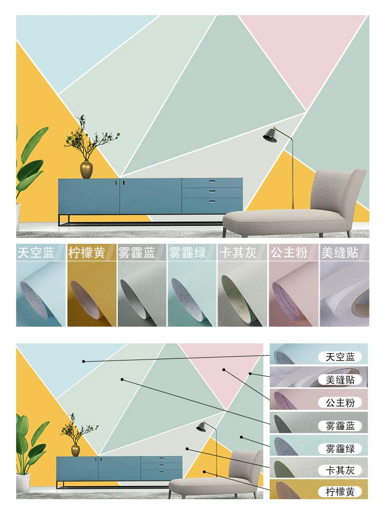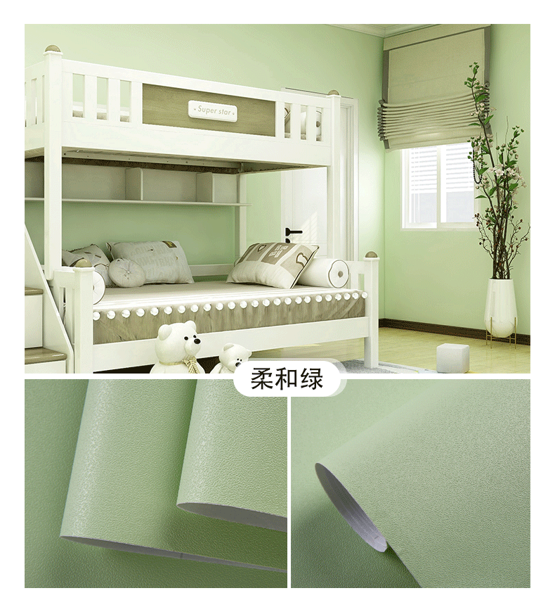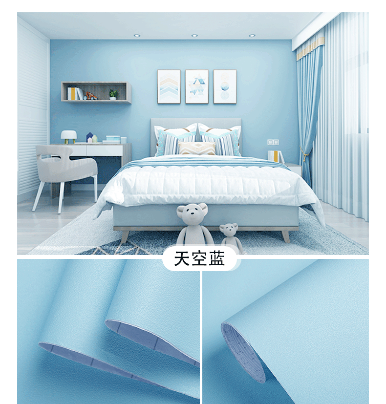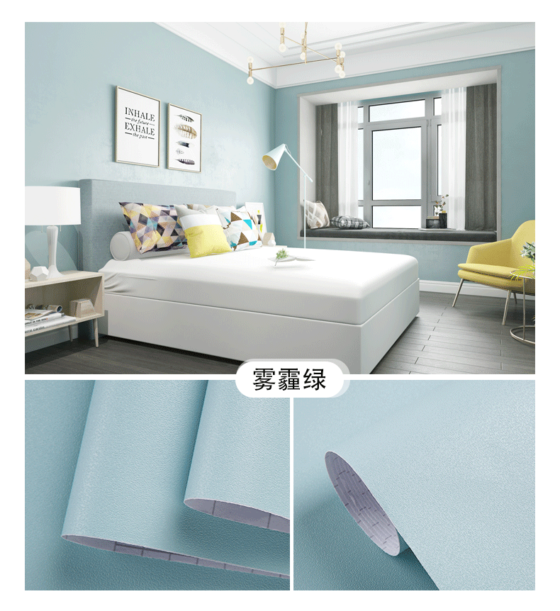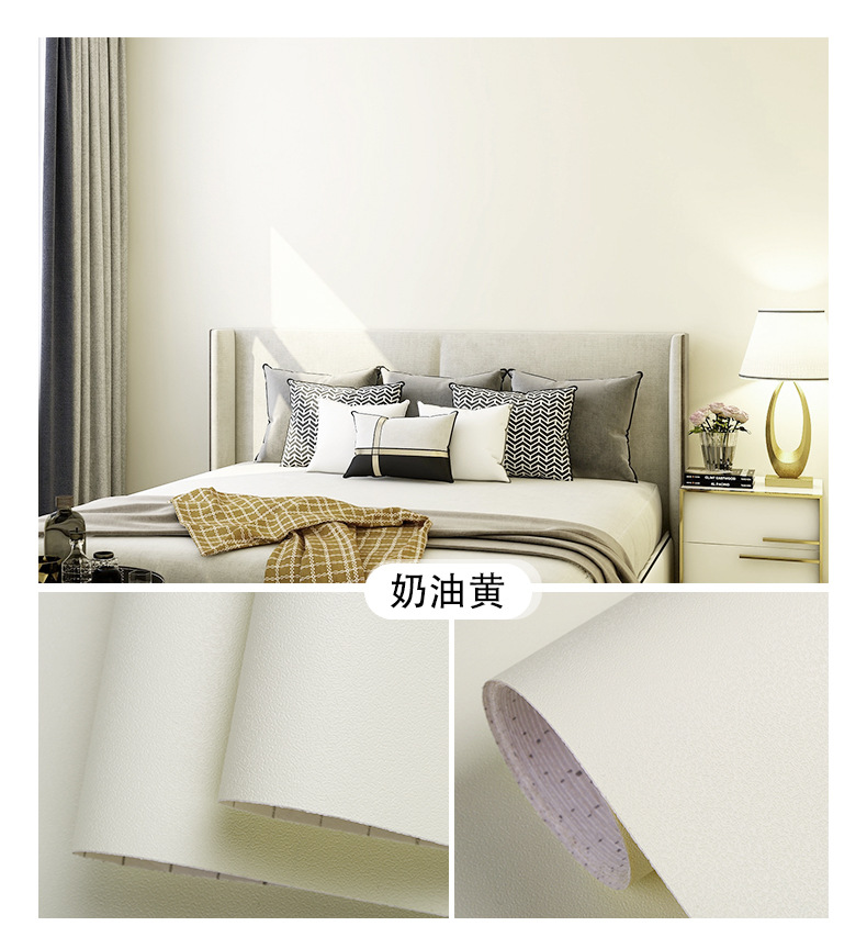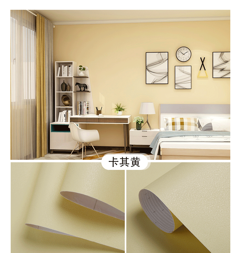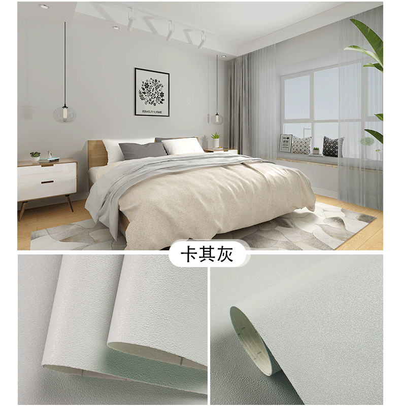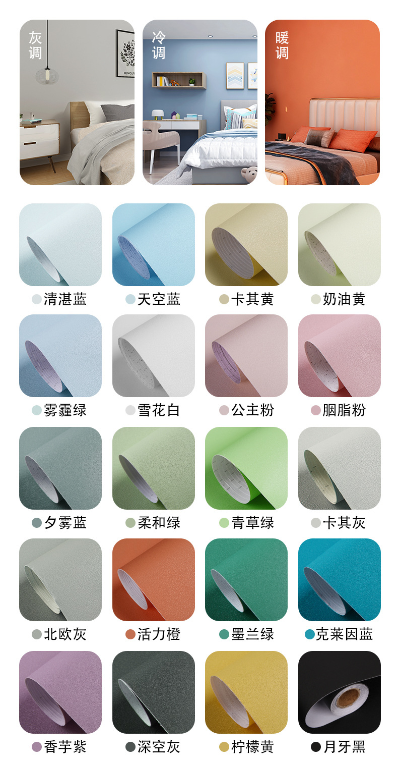 颜色分类腻子白墙纸(铝箔底防潮款),腻子白墙纸(PVC升级加厚款),水莲粉(铝箔底100%全遮瑕不透底),浅莲灰(铝箔底100%全遮瑕不透底),雪花白,北欧灰,公主粉,清湛蓝,卡其灰,天空蓝,卡其黄,奶油黄,雾霾绿,胭脂粉,夕雾蓝,柔和绿,青草绿,活力橙,墨兰绿,克莱因蓝,香芋紫,深空灰,柠檬黄,月牙黑