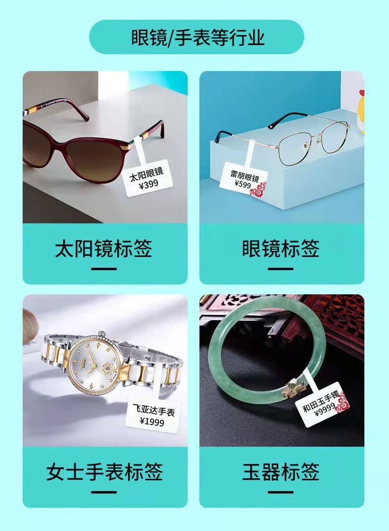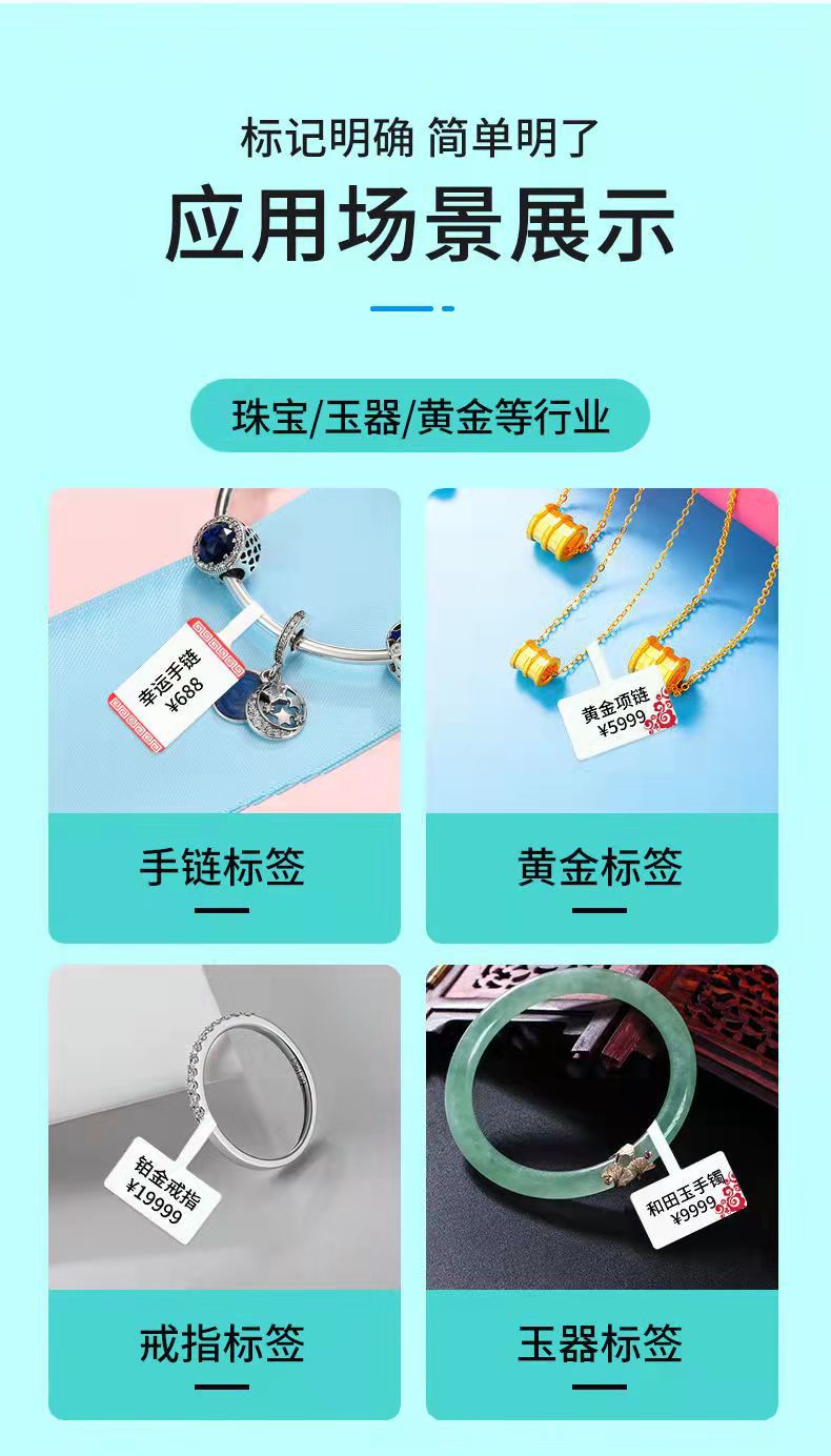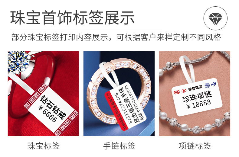 新增专用手镯加 长 款(因手镯较粗尾巴部分不够长) 此款珠宝标签采用合成纸+热敏图层+保护层结合,具有防刮,不可撕破,无需碳带的特点。不仅仅节约了打印成本,更加解放了打印效率,使得打印更简便。配合手持标签打印机直接打印。我们厂家有的打印团队可以个性代客打印标签,也有高端印刷设备专业设计定制彩色标签,欢迎咨询!
