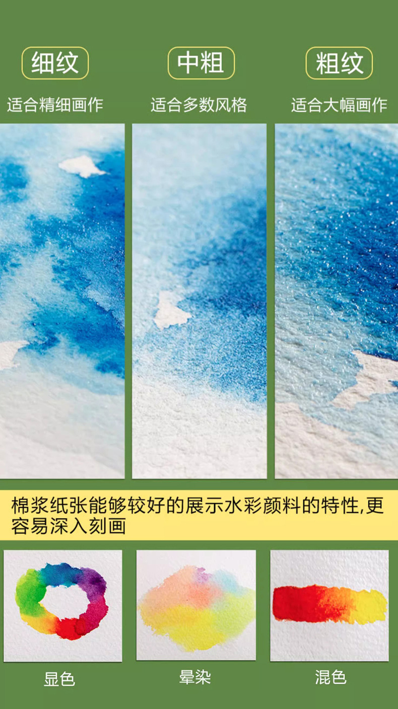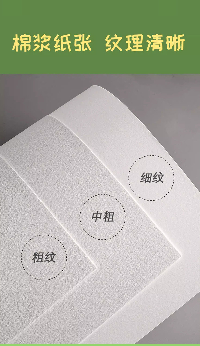 规格【木浆】【水彩纸】300克中纹,【半棉浆】【水彩纸】300克中纹,【全棉浆】【水彩纸】300克细纹,【全棉浆】【水彩纸】300克中纹,【全棉浆】【水彩纸】300克粗纹,【半棉】300克中纹5in*7in(32张)