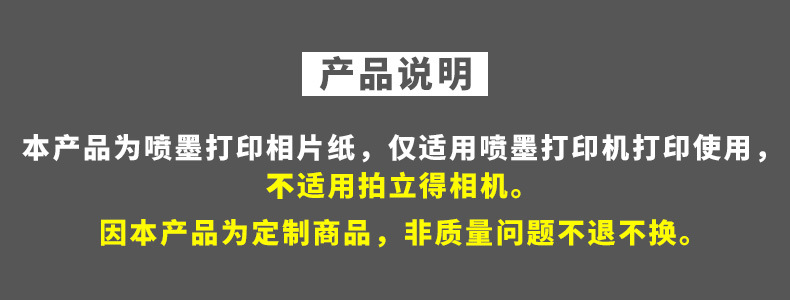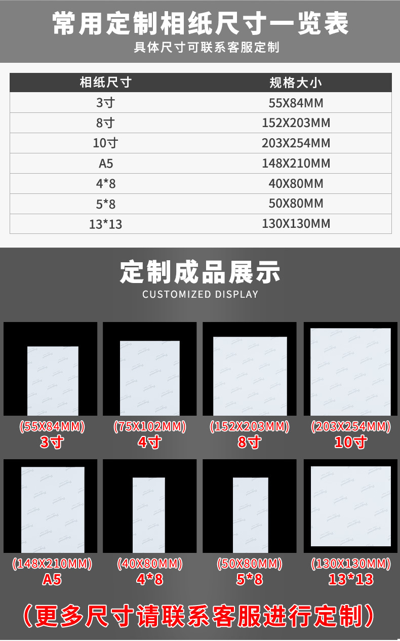 颜色88x60MM100张/包P字灰背印200g,3寸(55*84mm)100张/包P字灰背印200g,4寸(75*102mm)200张/包P字灰背印200g,8寸(152*203mm)200张/包P字灰背印200g,10寸(203*254mm)200张/包P字灰背印200g,12寸(203*305mm)200张/包P字灰背印200g,40*80mm100张/包P字灰背印200g,50*80mm100张/包P字灰背印200g,130*130mm100张/包P字灰背印200g,A5(148*210mm)100张/包P字灰背印200g,A5(148*210mm)100张/包240g,210*100mm100张/包P字灰背印200g