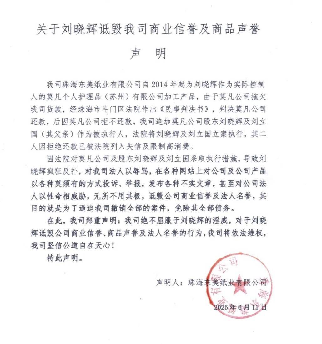 近日,珠海东美纸业有限公司遭遇一场无端的恶意攻击,公司商业信誉、商品声誉及法人名誉受到严重损害。而这场闹剧的始作俑者,正是莫凡个人护理品(苏州)有限公司的实际控制人刘晓辉。