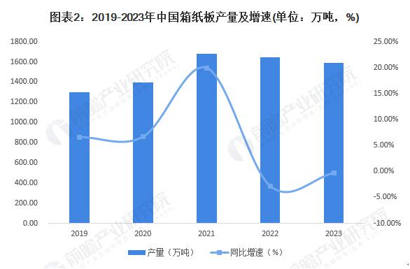 2019-2023 年,我国箱纸板产量波动变化,2022 和 2023 年连续两年出现下降。2023 年,我国箱纸板累计完成产量 1586.99 万吨,同比下降 0.32%。