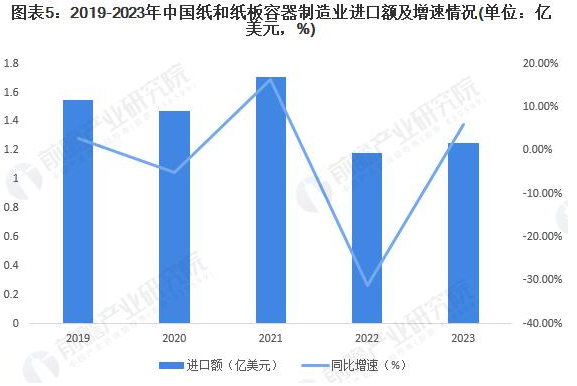 2019-2022 年我国纸和纸板容器制造业进口额呈波动变化趋势。2023 年行业累计完成进口额 1.25 亿美元,同比增长 5.88%。