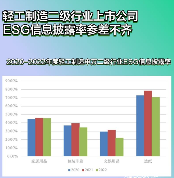根据中诚信绿金统计,截至2023年12月31日,家居用品、包装印刷、文娱用品、造纸ESG信息披露率分别达到45.57%、34.48%、22.22%、70.83%,造纸可持续信息披露率遥遥领先。