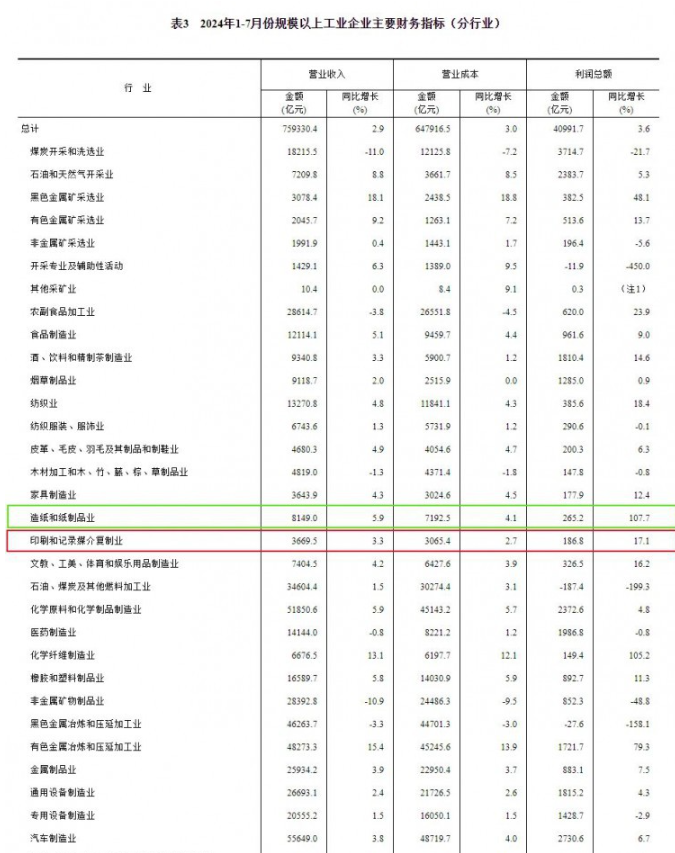 在41个工业大类行业中,造纸和纸制品业2024年1-7月实现利润总额265.2亿元,同比增长107.7%;印刷和记录媒介复制业2024年1-7月实现利润总额186.8亿元,同比增长17.1%。