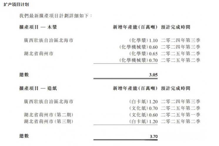 本年度内,本集团多个造纸及原料配置扩产项目如期投产。其中位于广西北海的新基地也正式投入营运,进一步扩大了本集团的市场覆盖范围。截至二零二四年六月三十日止,本集团之纤维原料总设计年产能为5.14百万吨(木浆2.38百万吨、再生浆0.70百万吨、木纤维2.06百万吨);造纸总设计年产能为21.67百万吨;下游包装厂总设计年产能为28.6亿平方米。