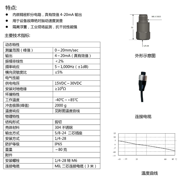 测量范围(有效值):0~20mm/s 输出:4~20mA 频率响应:10~1,000Hz(±1dB)