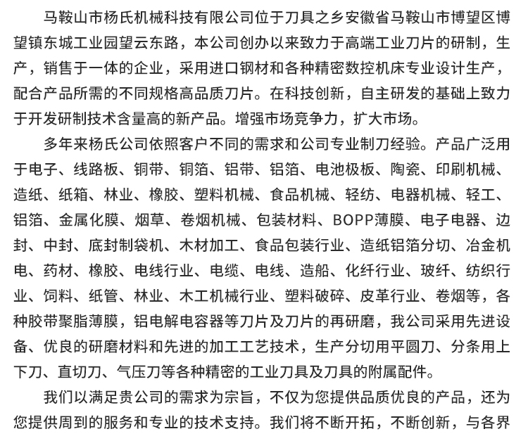收藏 0本网页所展示的有关【分切上刀 分条机刀片_刀片_马鞍山市杨氏机械科技有限公司】的信息/图片/参数等由德茂源毅丰的会员【马鞍山市杨氏机械科技有限公司】提供,由德茂源毅丰会员【马鞍山市杨氏机械科技有限公司】自行对信息/图片/参数等的真实性、准确性和合法性负责,本平台(本网站)仅提供展示服务,请谨慎交易,因交易而产生的法律关系及法律纠纷由您自行协商解决,本平台(本网站)对此不承担任何责任。您在本网页可以浏览【分切上刀 分条机刀片_刀片_马鞍山市杨氏机械科技有限公司】有关的信息/图片/价格等及提供【分切上刀 分条机刀片_刀片_马鞍山市杨氏机械科技有限公司】的商家公司简介、联系方式等信息。