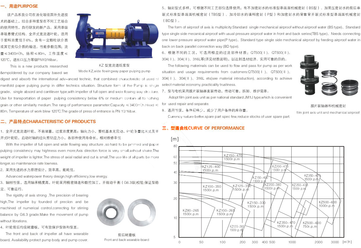KZ型宽流道纸浆泵是我公司消化吸收国外技术基础上自行开发研制的一种新型浆泵,采用全开式叶轮设计。该泵采用的结构形式决定了它输送介质的浓度相对闭式、半开式泵要高,介质通过能力强,轴向力小,对轴、轴承的损伤小,能耗低,因而其运行平稳、噪声低、维修方便。该泵采用单级单吸悬臂式结构,可在不拆卸泵进、出口管路情况下,对叶轮、后耐磨板、轴封部件和轴承架等进行拆卸或安装。