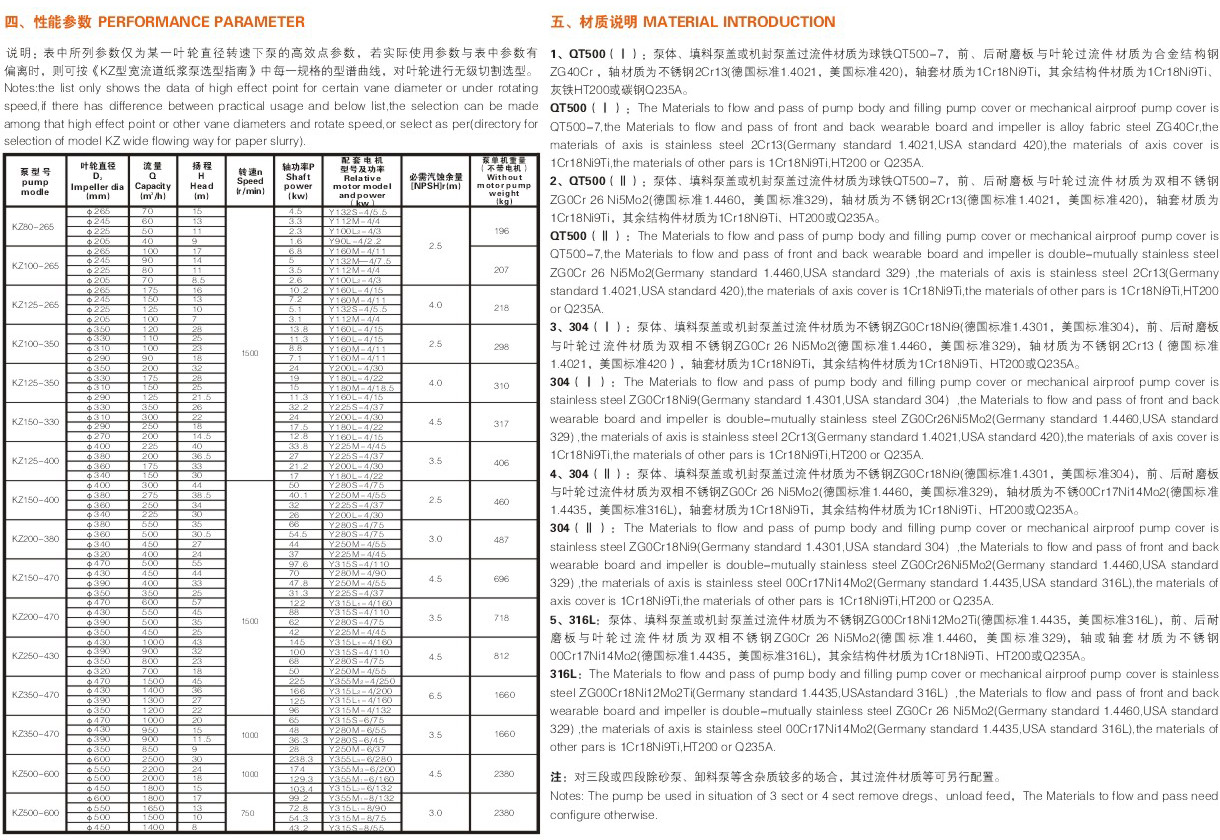 参数范围:流量40~2500m3/h,扬程7~57m,过流部位材质可采用HT300、SS304、SS316L、耐磨不锈钢、MT9超强耐磨不锈钢、329、2205、双相不锈钢等,轴采用2Cr13,详细选型及材质配置,根据工况及用户要求确定。
