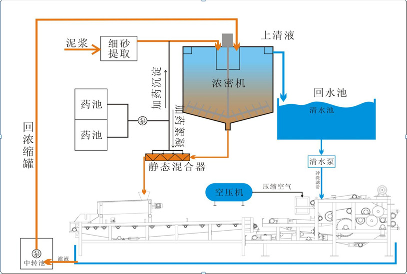 经过浓缩的污泥与一定浓度的絮凝剂在静态混合器中充分混合以后,污泥中的微小固体颗粒聚凝成体积较大的絮状团块,同时分离出自由水,絮凝后的污泥补输送到带式压滤机的重力脱水区,在重力作用下,自由水被分离,形成不流动状态的污泥,然后夹持在上下两条网带之间,经过楔形区,低压区和高压区,在由小到大的挤压力的作用下,进一步挤压污泥,达到脱水的目的,然后污泥与水分离,形成滤饼排出,方便储放和运输。对于不同类型的污泥,应采用不同的絮凝剂及其投加浓度、用量,以及不同的挤压辊数、不同的挤压方式,和滤带的不同结构、速度、张力的变化,来取得更加科学合理、经济适用的处理效果。