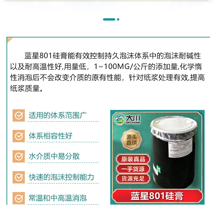 本网页所展示的有关【蓝星硅酯801硅膏 造纸漂白酒瓶电路板清洗化工蒸馏污水处理消泡剂_消泡剂_广州市大川精细化工有限公司】的信息/图片/参数等由德茂源毅丰的会员【广州市大川精细化工有限公司】提供,由德茂源毅丰会员【广州市大川精细化工有限公司】自行对信息/图片/参数等的真实性、准确性和合法性负责,本平台(本网站)仅提供展示服务,请谨慎交易,因交易而产生的法律关系及法律纠纷由您自行协商解决,本平台(本网站)对此不承担任何责任。您在本网页可以浏览【蓝星硅酯801硅膏 造纸漂白酒瓶电路板清洗化工蒸馏污水处理消泡剂_消泡剂_广州市大川精细化工有限公司】有关的信息/图片/价格等及提供【蓝星硅酯801硅膏 造纸漂白酒瓶电路板清洗化工蒸馏污水处理消泡剂_消泡剂_广州市大川精细化工有限公司】的商家公司简介、联系方式等信息。