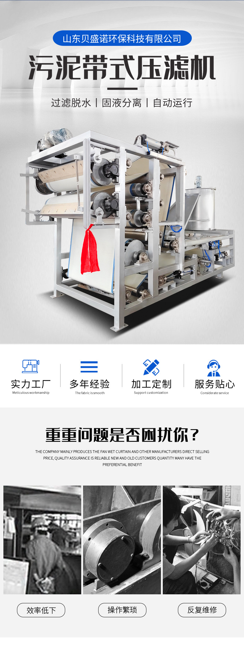 带式压滤机在造纸厂纸浆脱水及泥沙浓缩领域优势显著。结构上,其采用独特双网设计,上下滤网协同工作,形成稳定压榨空间,不仅能有效避免物料侧漏,还可对纸浆和泥沙施加均匀压力,实现高效脱水;性能上,处理量大、脱水效率高,相比传统脱水设备,可大幅缩短处理时间,提高生产效率,同时产出的滤饼含水率低,减少后续处理成本;材质方面,选用高强度、耐腐蚀材料,适应造纸污水复杂环境,使用寿命长;操作维护简单,自动化程度高,只需少量人工操作,且日常维护便捷,降低了人工成本与设备维护成本;此外,它还具备一机多用特性,既能处理纸浆,又可完成泥沙浓缩脱水工作,满足不同工况需求,是造纸厂及相关行业实现高效、稳定固液分离的理想设备。