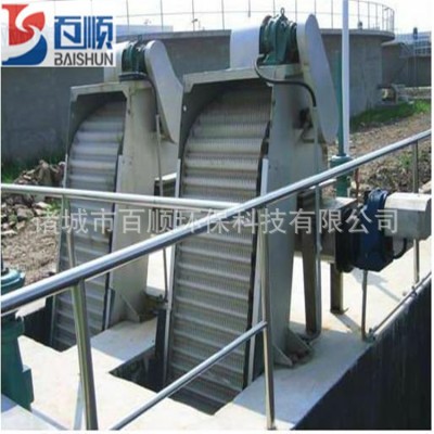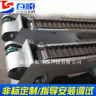 回转式格栅除污机是由一种耙齿厂装配成一组回转格栅链。在电机减速器的驱动下,耙齿链进行逆水流方向回转的运动。耙齿链运转到设备的上部时,由于槽轮和弯轨的导向,使每组耙齿之间产生相对自清运动,绝大部分固体物质靠重力落下。另一部分则依靠清扫器的反向运动把粘在耙齿上的杂物清扫干净。按水流方向耙齿链类同于格栅,在耙齿链轴上装配的耙齿间隙可以根据使用条件进行选择。当耙齿把流体中的固态悬浮物分离后可以保证水流畅通流过。整个工作过程是连续的,也可以是间歇的。