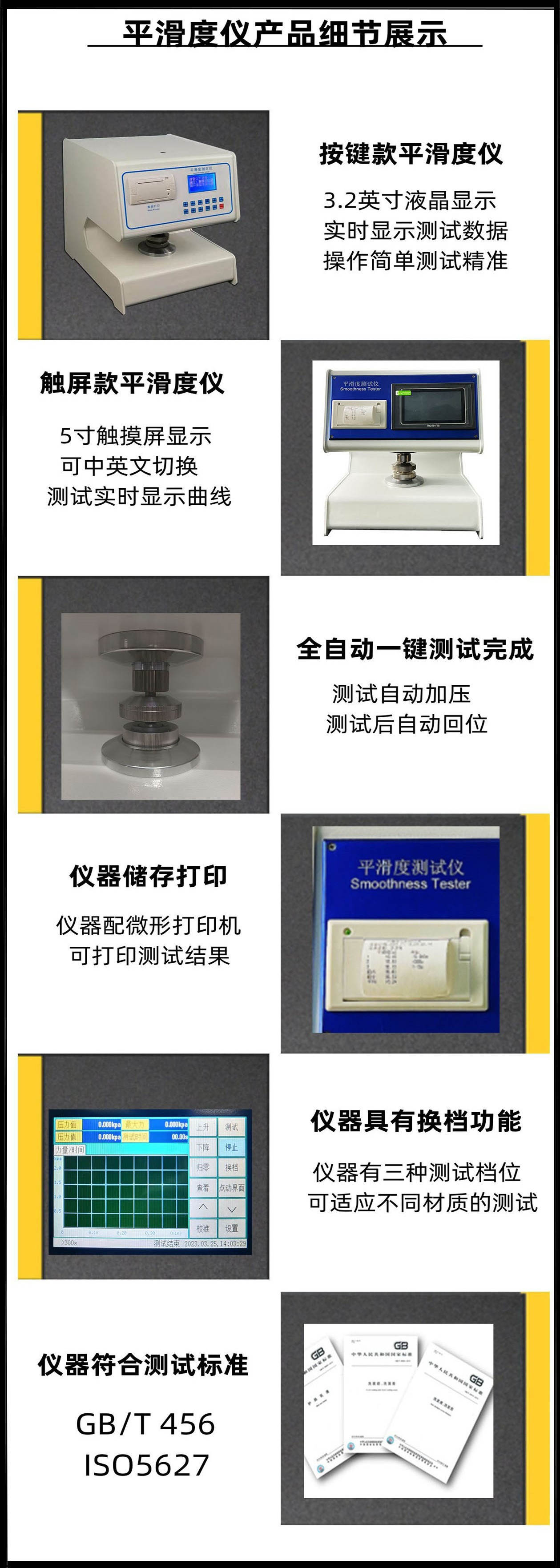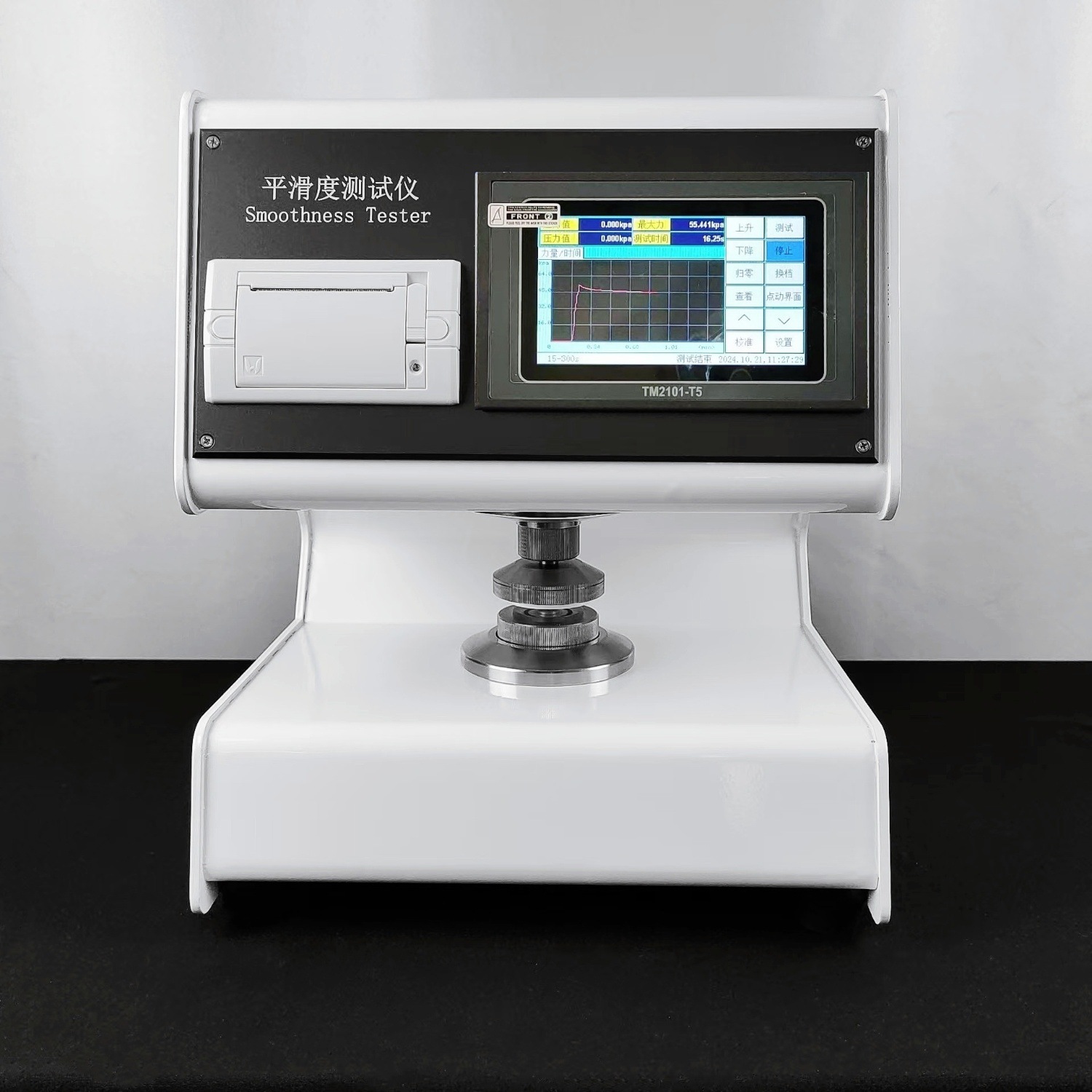 全自动平滑度测定仪是测定纸张平滑度的专用仪器。根据国际通用的别克(Bekk)式平滑仪工作原理设计。 仪器在机械设计上取消了传统的杠杆加重锤的手动施加压力结构,创新式地采用凸轮加弹簧,利用同步电机自动旋转加载标准压力。大大减少仪器的体积与重量。仪器采用5英寸触摸屏显示,具有中、英文菜单。界面美观亲和,操作简便,测试时一键操作。仪器同时具备测试、计算两面差的功能。仪器采用高精度传感器和原装进口无油真空泵等一系类先进的元器件。仪器具有标准中包含的各项参数测试、转换、调节、显示、记忆、打印功能,仪器具有强大数据处理能力,可直接得出各项数据的统计结果。这些数据存储在主芯片内,可以通过触屏操作查看。仪器具有技术先进、功能齐全、性能可靠、操作方便等优点,是造纸、包装、科研及产品质量监督检验等行业和部门理想的试验设备。