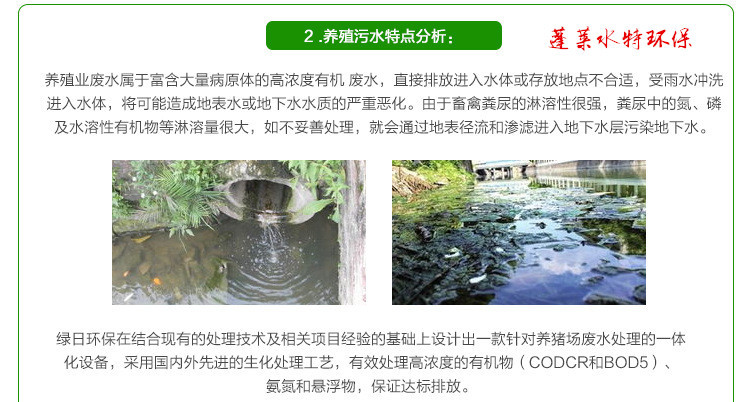 养殖污水的主要特征是:有机物浓度高,悬浮物多,色度深,并含有大量的细菌,氨氮、有机磷含量高,COD高达3000~12000mg/L,氨氮高达800~2200mg/L,SS超标数十倍。