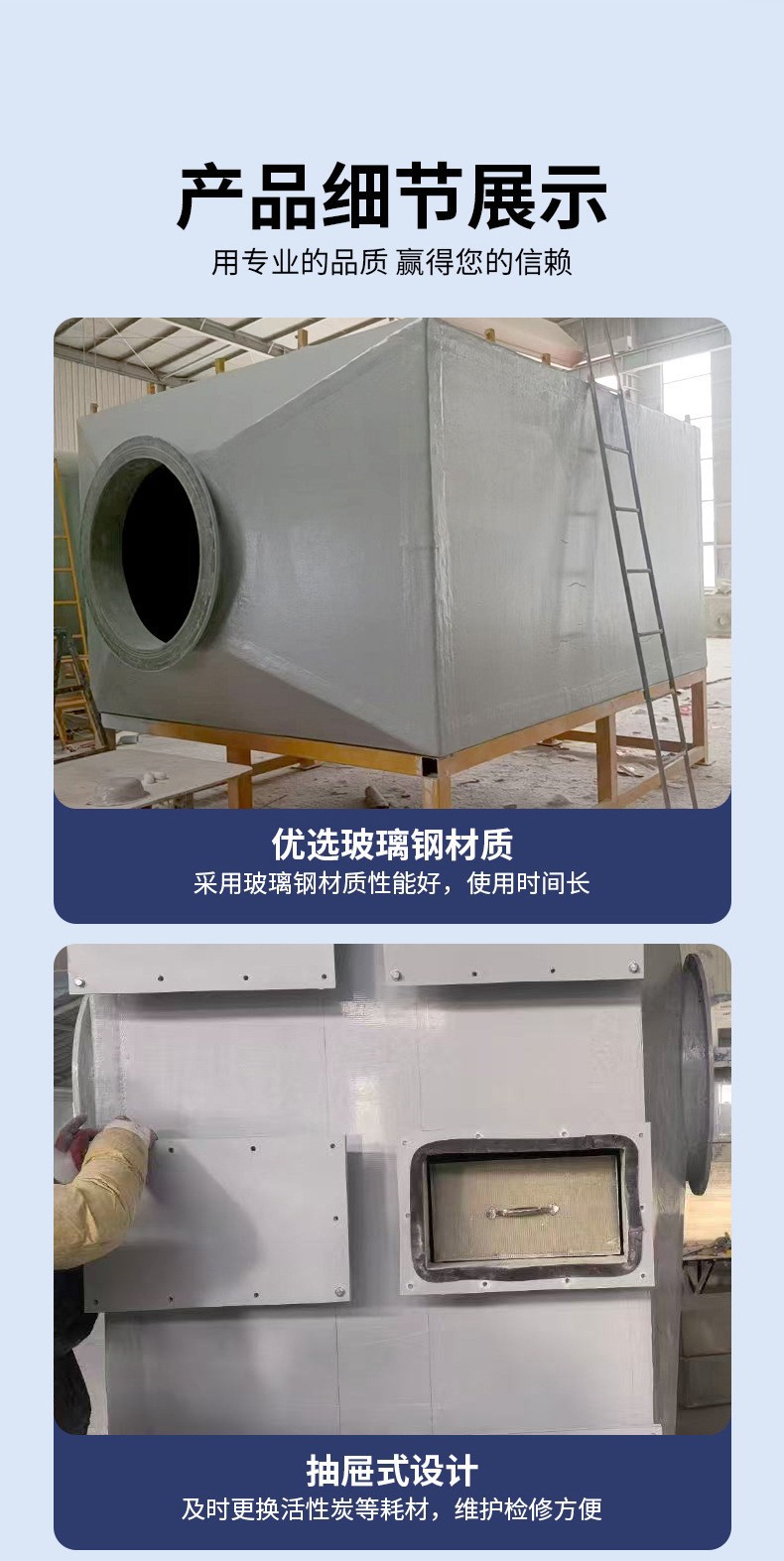 本网页所展示的有关【活性炭吸附箱高效过滤除臭废气吸附箱漆雾净化过滤玻璃钢活性炭箱_活性炭吸附箱_河北欧博百亿玻璃钢科技开发有限公司】的信息/图片/参数等由德茂源毅丰的会员【河北欧博百亿玻璃钢科技开发有限公司】提供,由德茂源毅丰会员【河北欧博百亿玻璃钢科技开发有限公司】自行对信息/图片/参数等的真实性、准确性和合法性负责,本平台(本网站)仅提供展示服务,请谨慎交易,因交易而产生的法律关系及法律纠纷由您自行协商解决,本平台(本网站)对此不承担任何责任。您在本网页可以浏览【活性炭吸附箱高效过滤除臭废气吸附箱漆雾净化过滤玻璃钢活性炭箱_活性炭吸附箱_河北欧博百亿玻璃钢科技开发有限公司】有关的信息/图片/价格等及提供【活性炭吸附箱高效过滤除臭废气吸附箱漆雾净化过滤玻璃钢活性炭箱_活性炭吸附箱_河北欧博百亿玻璃钢科技开发有限公司】的商家公司简介、联系方式等信息。