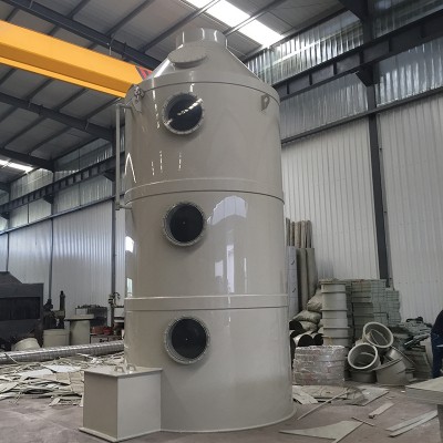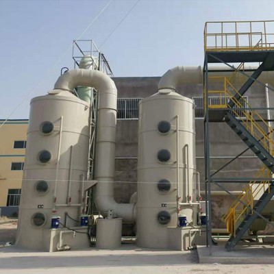 在废气处理过程中,废气通过风机压力进入塔体内,在塔体内经过多次水和填料的净化和过滤,使废气浓度降低,以达到环保标准,从而通过出风口排出。当混合气从洗涤塔底部通过洗涤塔,由于塔板间存在产物组分液体,产物组分气体液化的同时蒸发部分,而杂质由于不能被液化或凝固,当通过有液体存在的塔板时将会被产物组分液体固定下来,产生洗涤作用,洗涤塔就是根据这一原理设计和制造的。洗涤塔利用气体与液体间的接触,而将气体中的污染物传送到液体中,然后再将清洁气体与被污染的液体分离,达到清净空气的目的。废气经由填充式酸雾洗涤塔,采用气液逆吸收方式处理,即液体自塔顶向下以雾状(或小液滴)喷撒而下。废气则由塔体(逆向流)达到气液接触之目的。此处理方可冷却废气、调理气体及去除颗粒,再经过除雾段处理后,排入大气中。