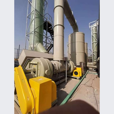 在废气处理过程中,废气通过风机压力进入塔体内,在塔体内经过多次水和填料的净化和过滤,使废气浓度降低,以达到环保标准,从而通过出风口排出。当混合气从洗涤塔底部通过洗涤塔,由于塔板间存在产物组分液体,产物组分气体液化的同时蒸发部分,而杂质由于不能被液化或凝固,当通过有液体存在的塔板时将会被产物组分液体固定下来,产生洗涤作用,洗涤塔就是根据这一原理设计和制造的。洗涤塔利用气体与液体间的接触,而将气体中的污染物传送到液体中,然后再将清洁气体与被污染的液体分离,达到清净空气的目的。废气经由填充式酸雾洗涤塔,采用气液逆吸收方式处理,即液体自塔顶向下以雾状(或小液滴)喷撒而下。废气则由塔体(逆向流)达到气液接触之目的。此处理方可冷却废气、调理气体及去除颗粒,再经过除雾段处理后,排入大气中。