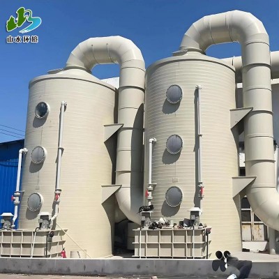 在呈酸性或碱性的酸雾废气,内置有新型的阶梯环填料(或球型多面空心填料),气-液接触比表面积大;当废气经过分配板,将气体平均分布于多面空心球,每只呈点接触,摆列后呈“W”路线行走,避免有偏流现象,在配合龙卷式不阻塞的喷嘴,呈1200喷洒,使气液混合效率90-95%,通过逆流式吸收液(中和液H2SO4或NaOH自动添加处理设备)的雾化喷淋洗涤,从而达到洁净效果,再加入中和液,可祛除废气中有害气体。一般设有二级喷淋装置,并可根据气体浓度不同,组成更多层的喷淋装置,而达到高效率的净化效果。