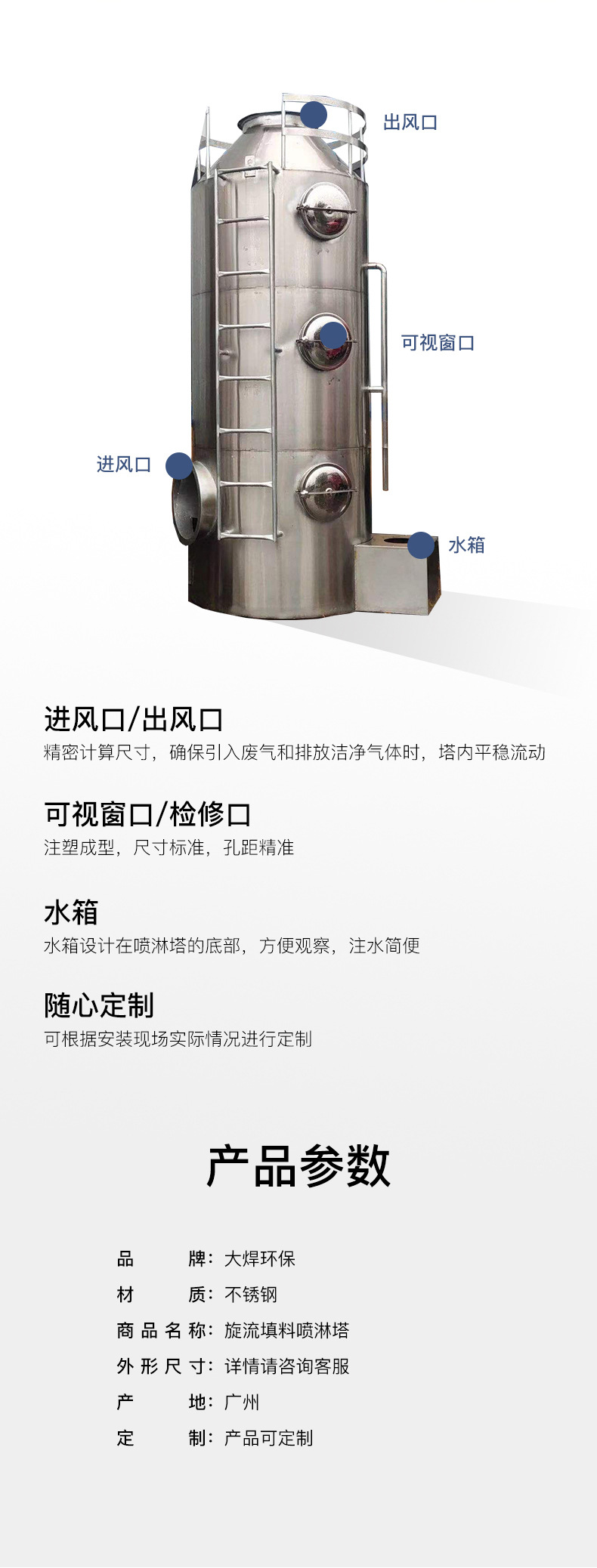 本网页所展示的有关【不锈钢喷淋塔厂家批发直供塑胶喷雾注塑工业废气净化吸附耐腐蚀_喷淋塔_广州大焊机械设备有限公司】的信息/图片/参数等由德茂源毅丰的会员【广州大焊机械设备有限公司】提供,由德茂源毅丰会员【广州大焊机械设备有限公司】自行对信息/图片/参数等的真实性、准确性和合法性负责,本平台(本网站)仅提供展示服务,请谨慎交易,因交易而产生的法律关系及法律纠纷由您自行协商解决,本平台(本网站)对此不承担任何责任。您在本网页可以浏览【不锈钢喷淋塔厂家批发直供塑胶喷雾注塑工业废气净化吸附耐腐蚀_喷淋塔_广州大焊机械设备有限公司】有关的信息/图片/价格等及提供【不锈钢喷淋塔厂家批发直供塑胶喷雾注塑工业废气净化吸附耐腐蚀_喷淋塔_广州大焊机械设备有限公司】的商家公司简介、联系方式等信息。
