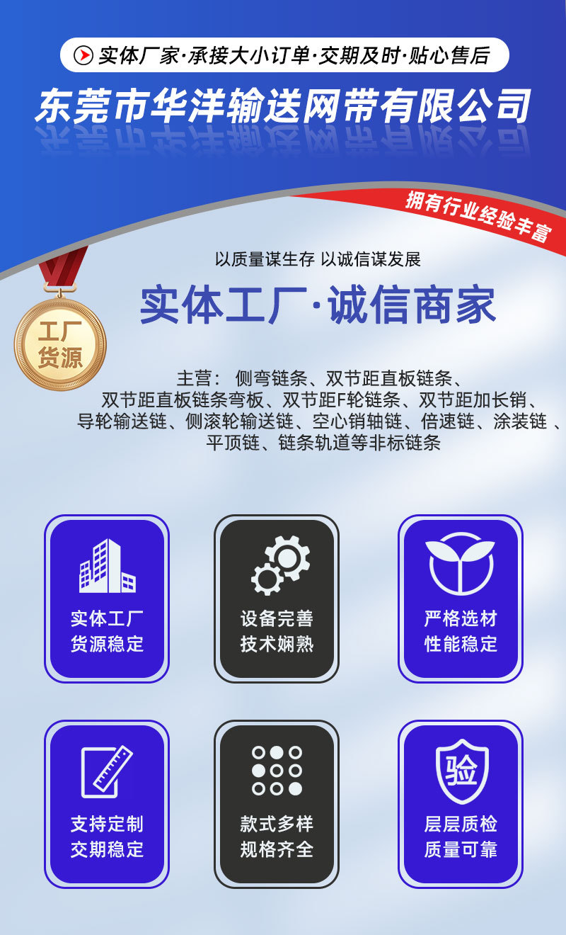 本网页所展示的有关【工业传动链条双排链条异型大节距重型带双耳弯板不锈钢链条_输送链条_东莞市华洋输送网带有限公司】的信息/图片/参数等由德茂源毅丰的会员【东莞市华洋输送网带有限公司】提供,由德茂源毅丰会员【东莞市华洋输送网带有限公司】自行对信息/图片/参数等的真实性、准确性和合法性负责,本平台(本网站)仅提供展示服务,请谨慎交易,因交易而产生的法律关系及法律纠纷由您自行协商解决,本平台(本网站)对此不承担任何责任。您在本网页可以浏览【工业传动链条双排链条异型大节距重型带双耳弯板不锈钢链条_输送链条_东莞市华洋输送网带有限公司】有关的信息/图片/价格等及提供【工业传动链条双排链条异型大节距重型带双耳弯板不锈钢链条_输送链条_东莞市华洋输送网带有限公司】的商家公司简介、联系方式等信息。