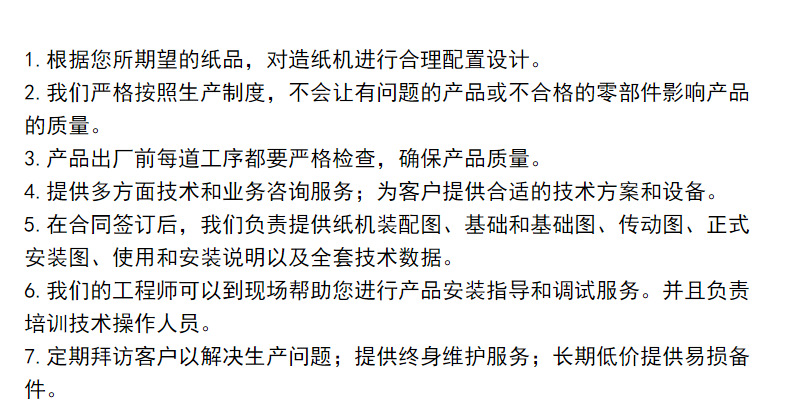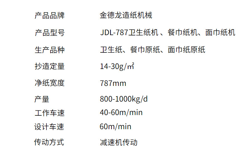 金德龙自2007年成立以来,秉承“质量求金,诚信树德”的企业生存理念,始终遵循“诚信守诺、合作共赢”的企业精神, 全力做好客户的售前售中售后工作,坚持“与纸业同步,与世界同行的发展理念。主要生产造纸机及造纸设备,生产各种规格高车速卫生纸造纸机,新月型卫生纸造纸机、瓦楞纸造纸机,文化纸书写纸造纸机,牛皮纸造纸机以及圆网造纸机,长网造纸机,叠网造纸机。我们主要生产造纸机械、制浆设备和其他相关零件。我们注重质量和客户的需求,不断提高我们的技术和服务。 汇集了一批具有20多年生产经验的工程技术人员和专家组成的技术队伍,使我们有能力加工各类造纸机械,使我们在市场上具有竞争力。